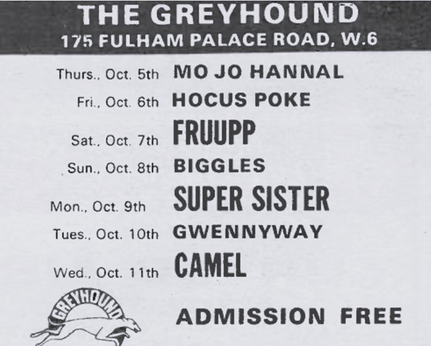 I think we all liked The Greyhound in the Fulham Palace Road about the best. We didn’t get an awful lot of gigs anywhere, but we all liked playing The Greyhound because there were masses of people. It got rammed up the steps, along the top, down the side and round the stage – everywhere. People there to enjoy themselves. And Duncan Fergy, Ferguson, the landlord, was a great bloke as well. So, we loved him. So, the Greyhound would be my favourite, yeah.
